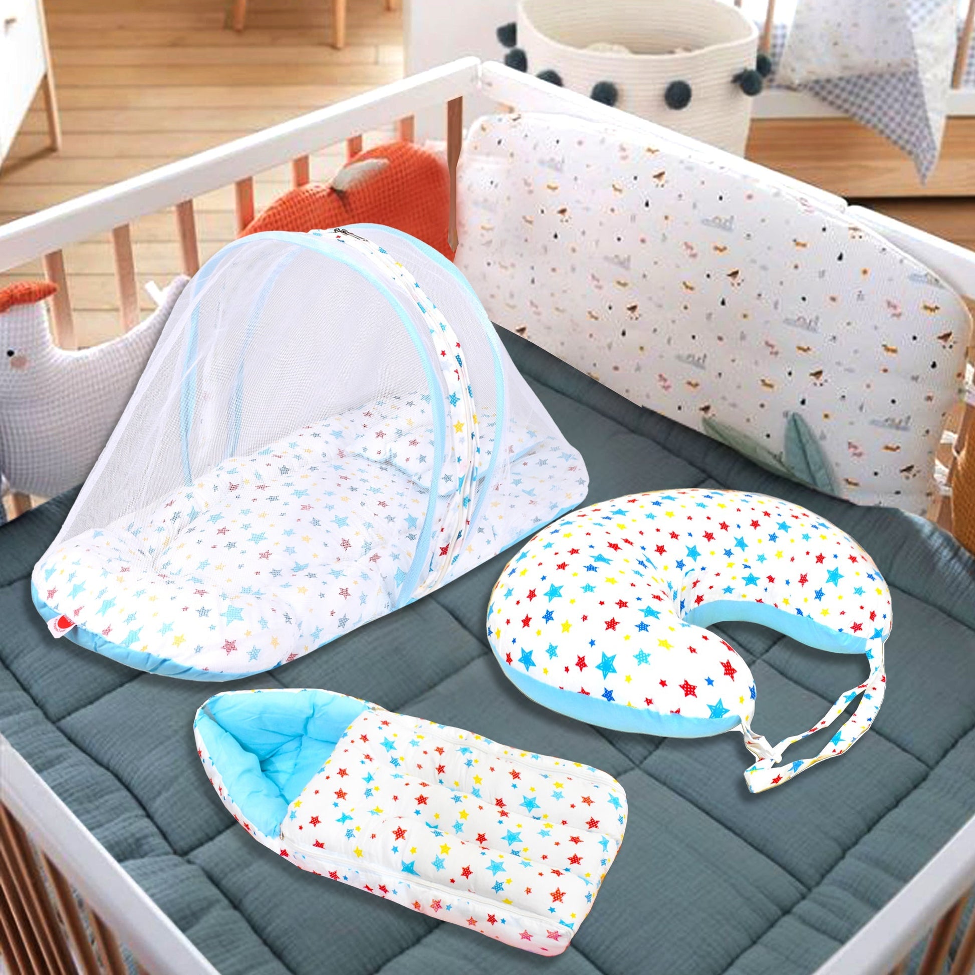 VParents joy Baby Feeding Pillow Bedding Set with Mosquito net and Sleeping Bag Combo Cotton, 0-6 Months, 3 Pcs